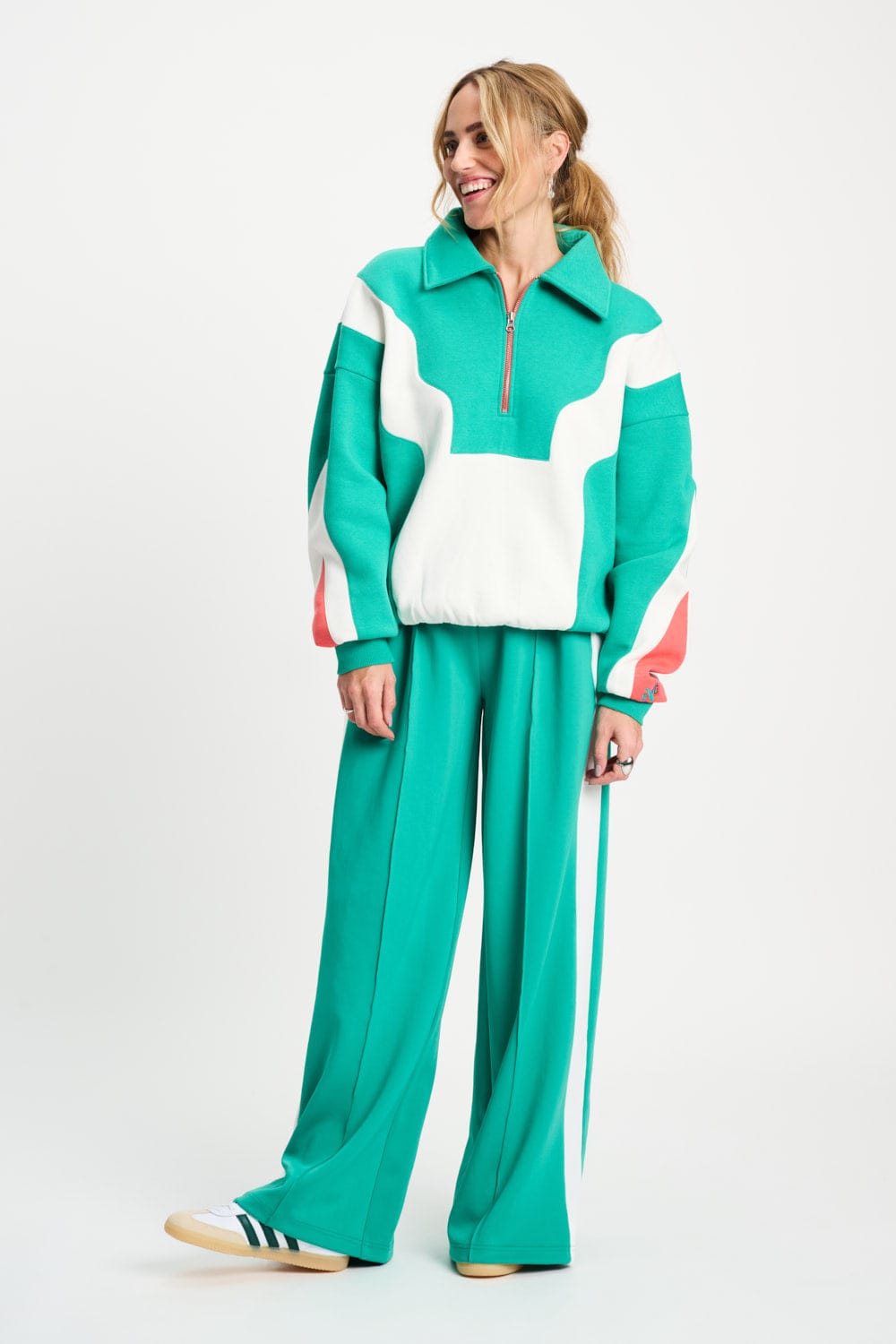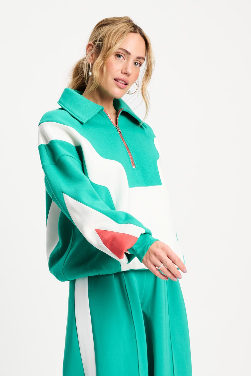 • Green sweater with white and orange colour blocks